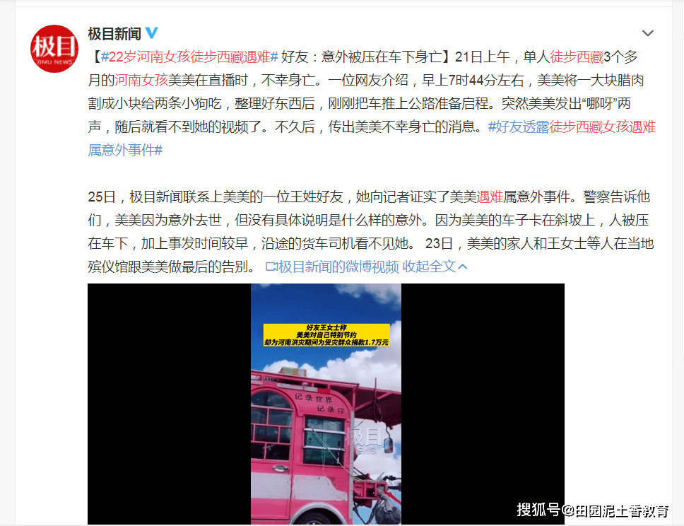 原标题:22岁河南女孩美美徒步西藏直播时遇难: 好友称“意外被压在车下身亡”