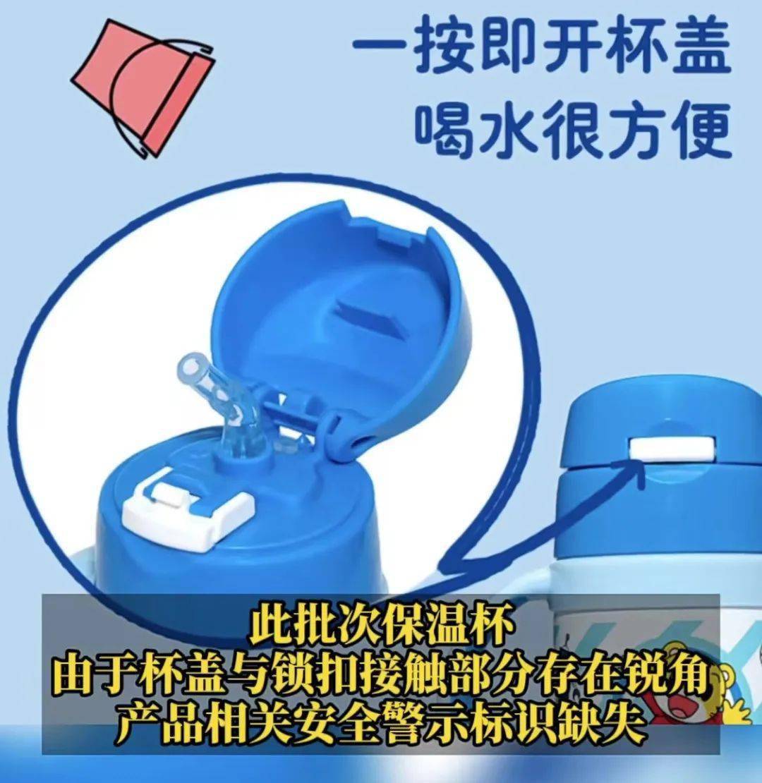 本次召回范围内的儿童保温吸管杯,因为杯盖与锁扣触摸部分存在锐角,产品相关安全警示标识缺失,在保温杯开盖后未向后卡紧时,或许会引起上盖向下闭合,触碰儿童面部,存在安全危险。